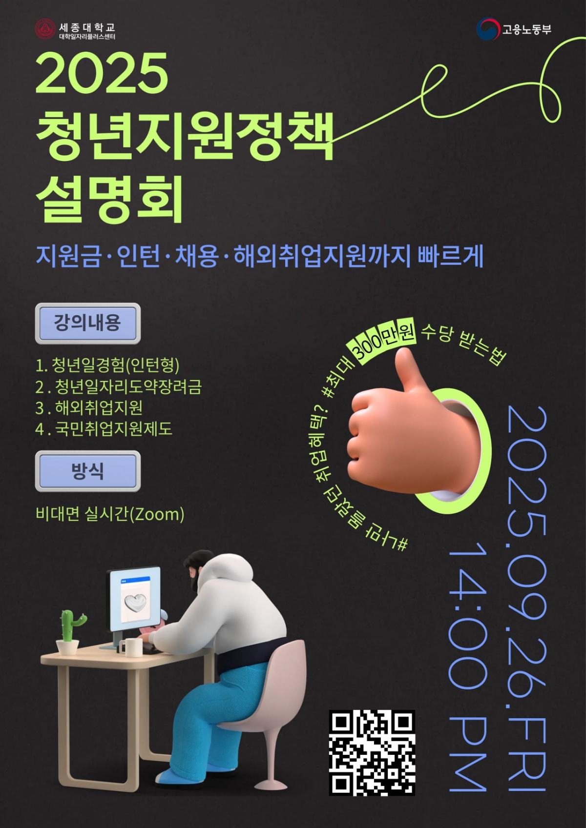 세종대학교 대학일자리플러스센터는 26일 오후 2시 청년 구직자를 대상으로 "2025년 청년취업지원정책 설명회"를 개최한다고 23일 밝혔다. 설명회에서는 청년일경험 인턴형, 청년일자리도약장려금, 해외취업지원(K무브), 국민취업지원제도 등 4대 정책을 중심으로 취업지원금, 인턴, 채용, 해외취업 지원 등 실질적인 혜택을 안내한다. 정책별 신청 요건과 활용 전략도 상세히 소개하며, 참여 신청은 세종대 유드림 홈페이지를 통해 가능하고 비대면 Zoom 방식으로 진행된다.